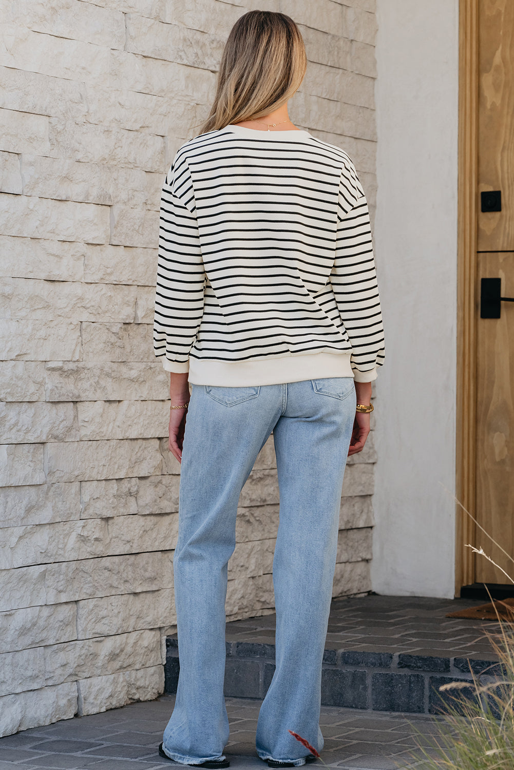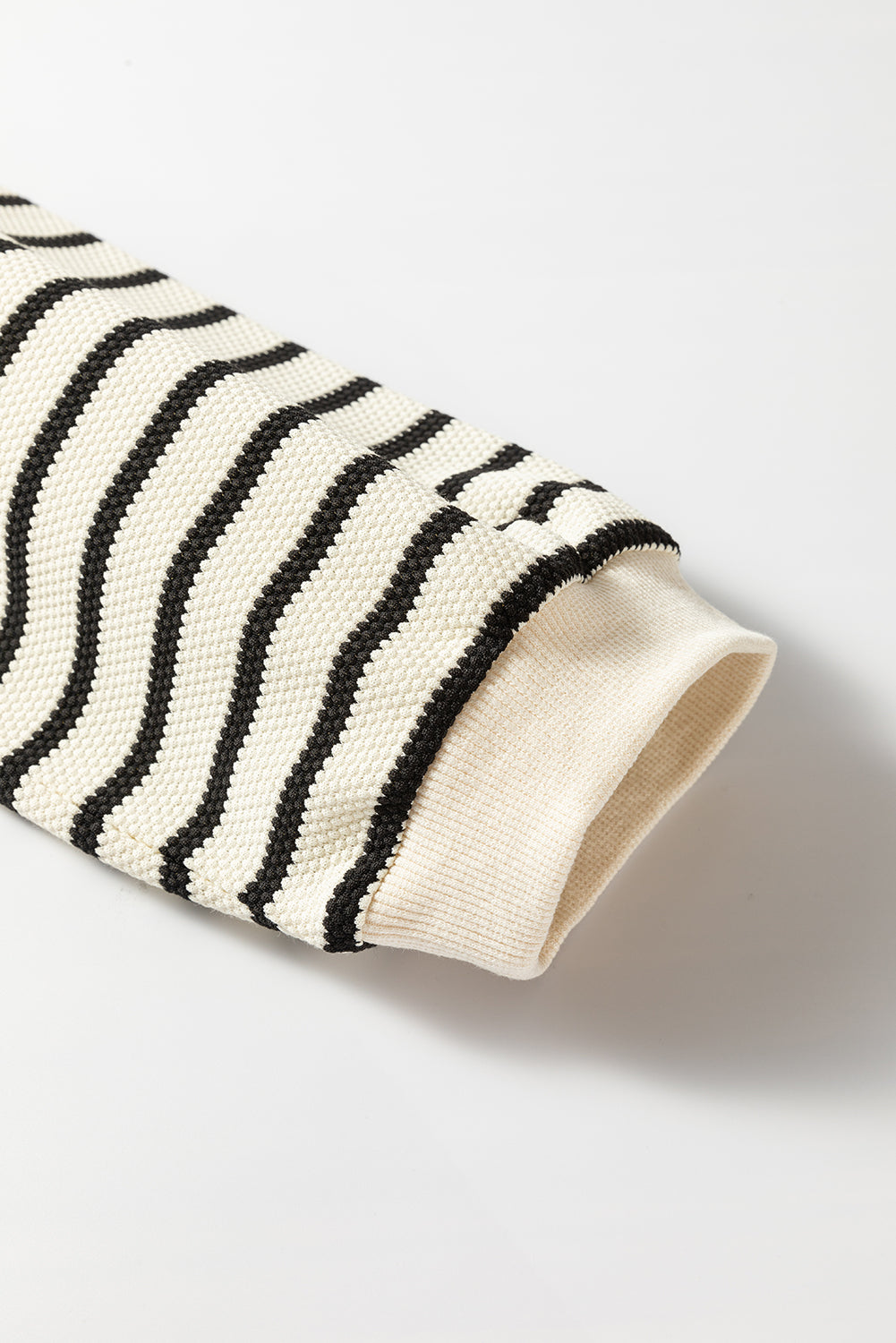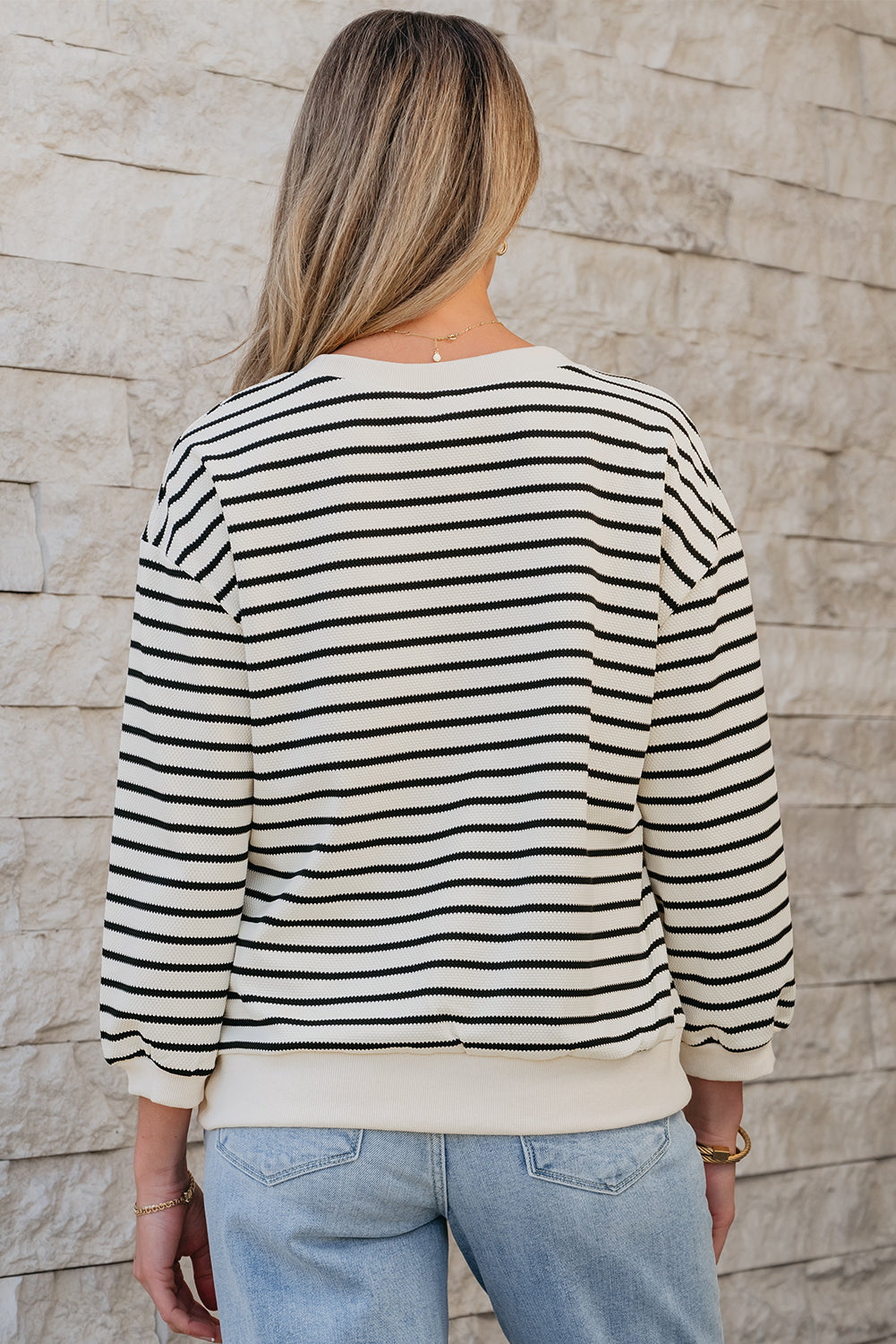 Drop shoulder design with 3/4 bubble sleeves, and ribbed details.