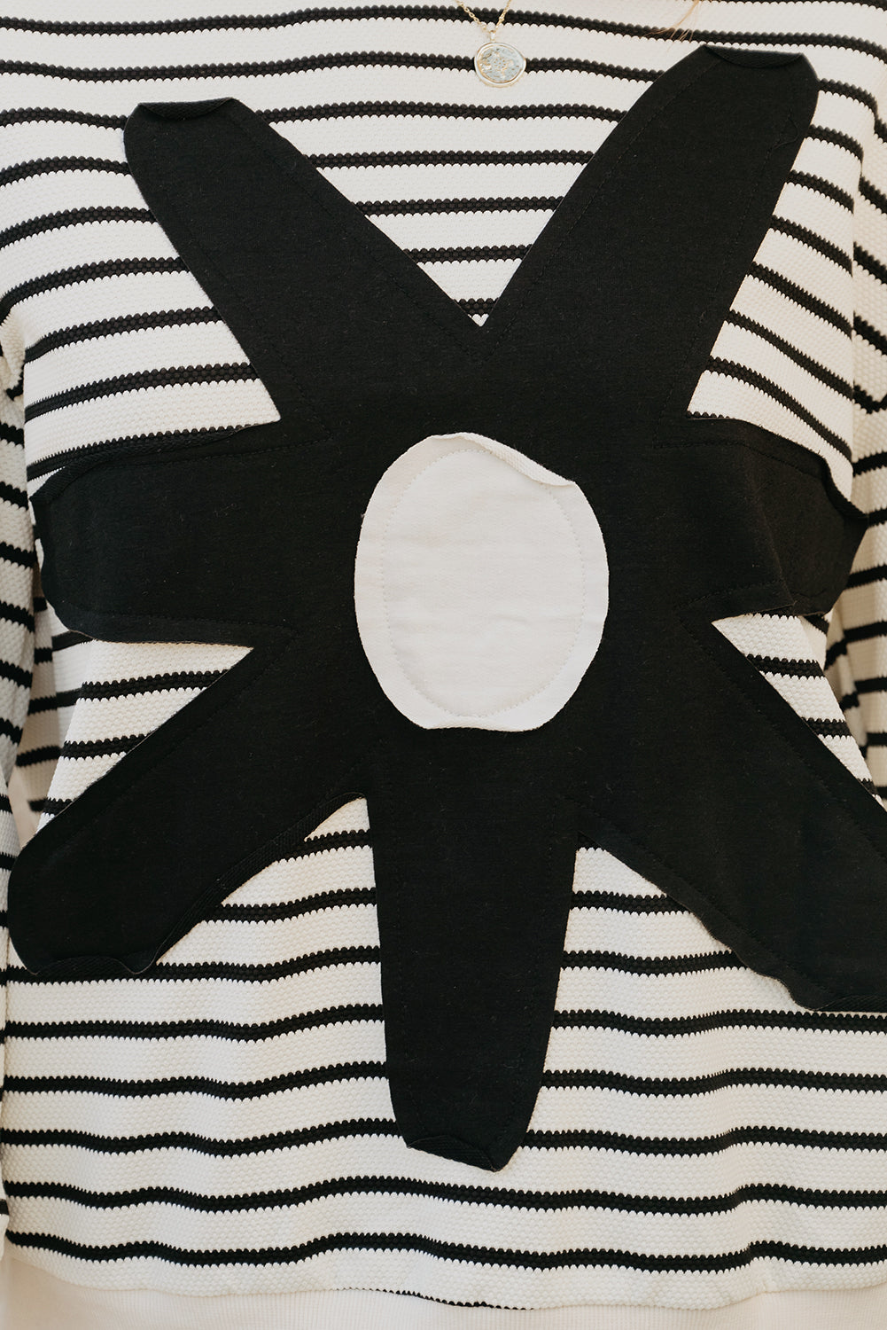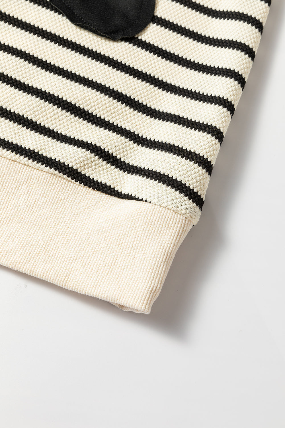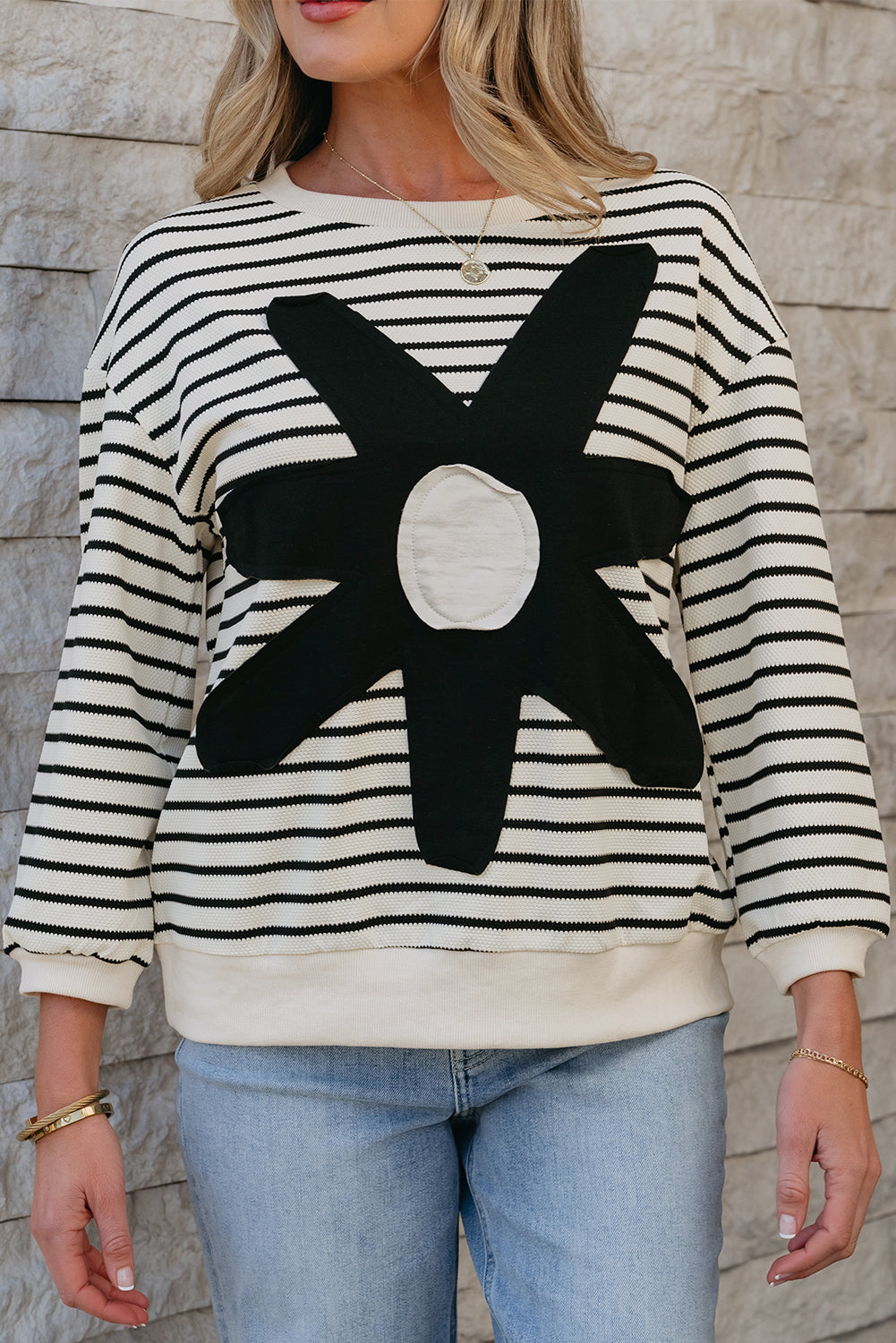Black white Striped Big Flower Patched 3/4 Sleeve Top